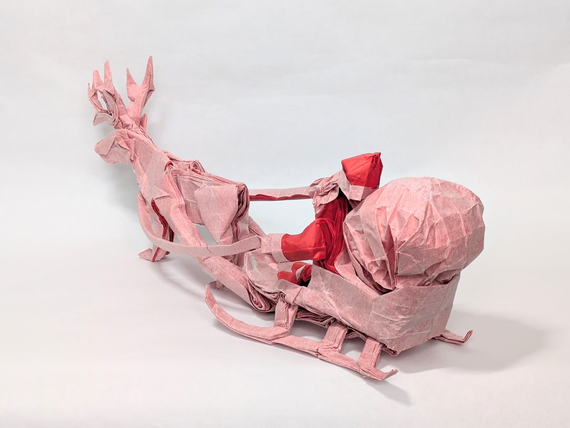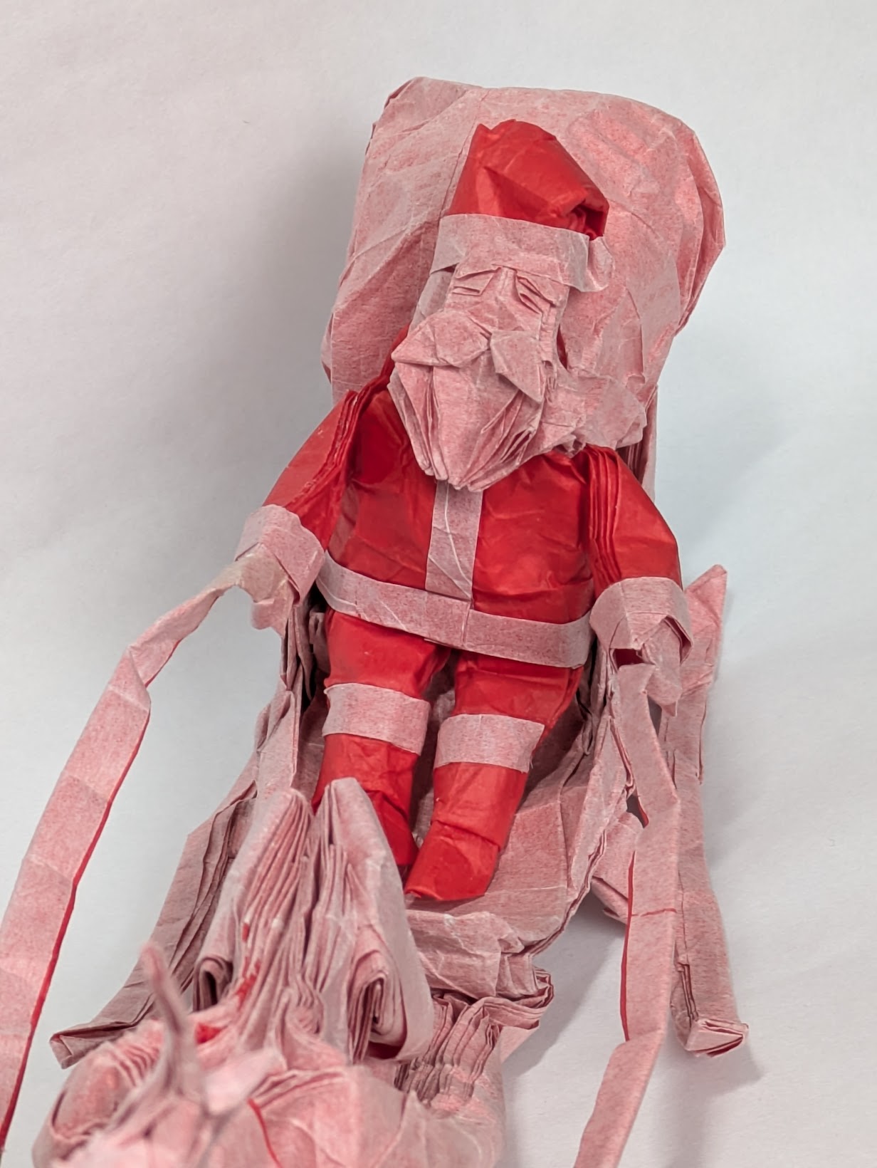 1枚の紙から、サンタ、そり、トナカイ全てを折り出しました。